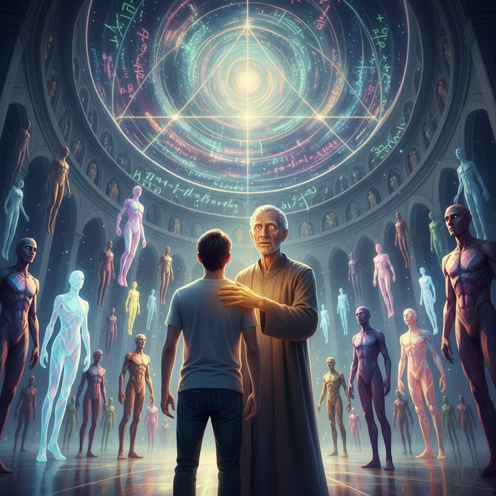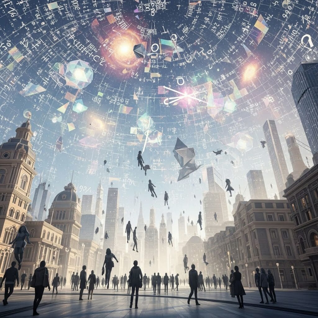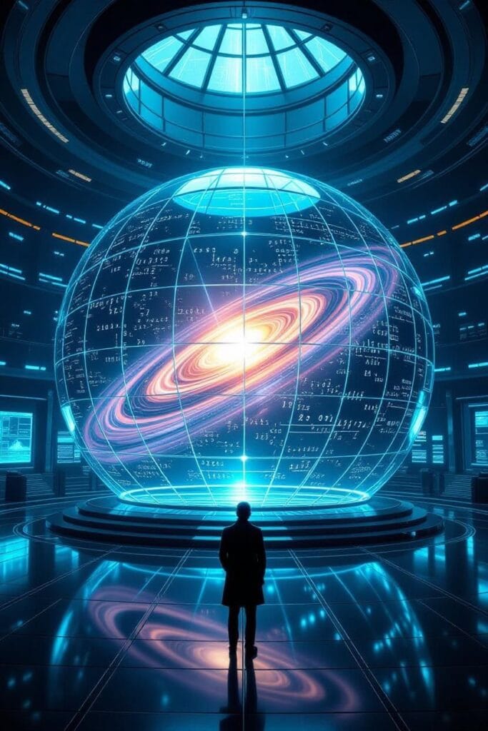They all moved beneath a massive dome that curved overhead like a cathedral made of light and mathematics. Equations shimmered faintly in the air, almost legible.