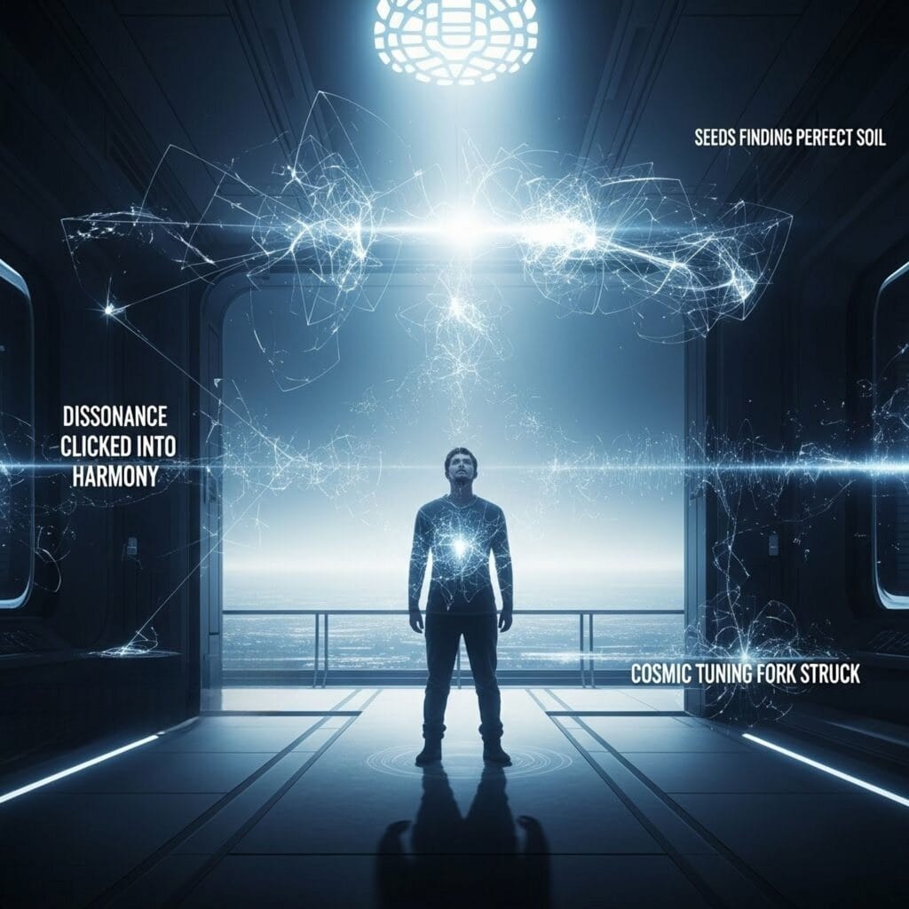 Dissonance clicked into harmony – a cosmic tuning fork struck somewhere in his chest, and every frequency remembered the same song. The white-knuckle need for logic loosened. The part of him fighting the impossibility finally agreed to a ceasefire.