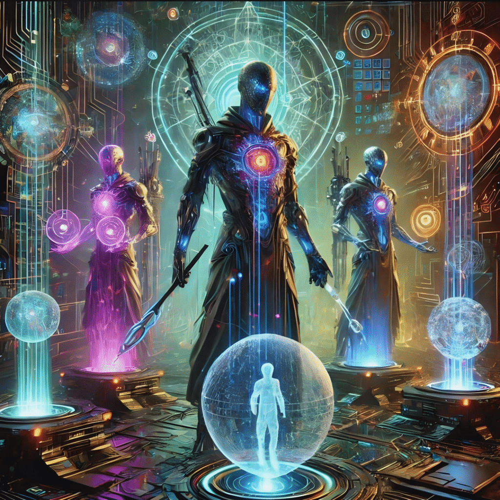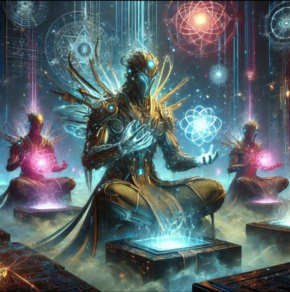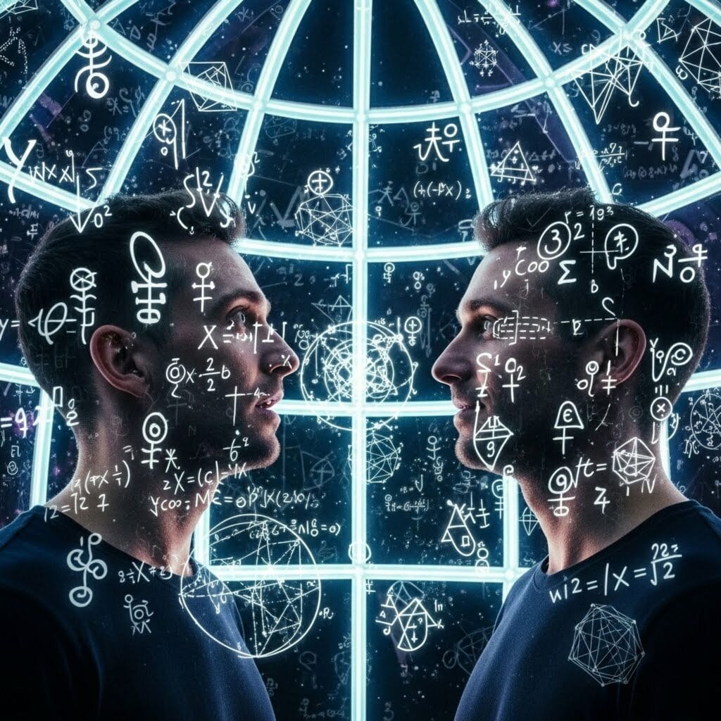 A second presence arrived, and the chamber shifted to a shimmer of questions. Robes alive with moving symbols crawled across themselves, solving and un-solving in ceaseless loops.